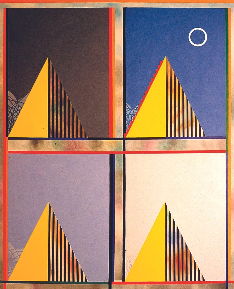 The selected piece showcases Mir's distinctive visual vocabulary: vibrant yellow triangular forms with linear striations set against contrasting backgrounds of deep purples and earth tones, framed by his signature colorful borders. These elements create what art critics have described as "metaphysical statements" and "spatial cosmic paintings with vast emptiness."